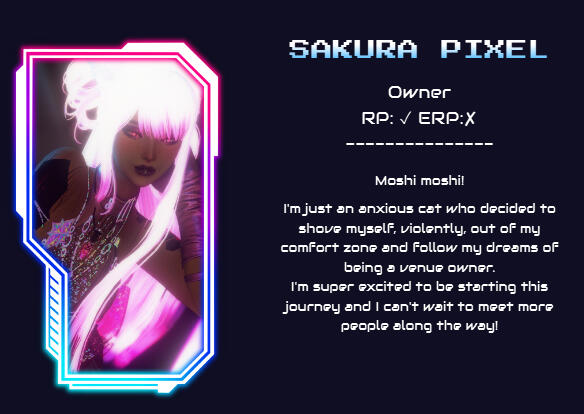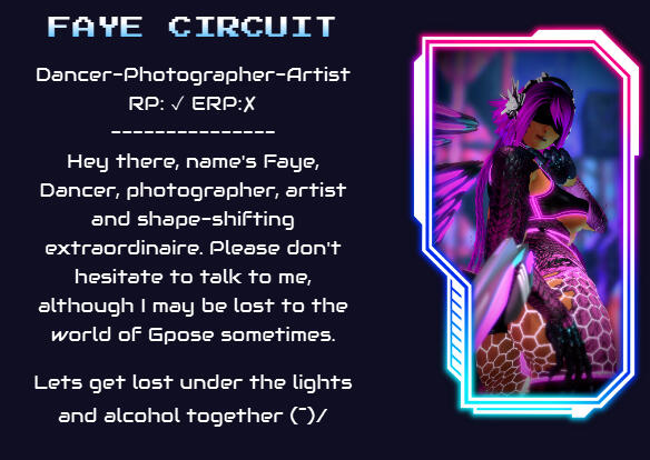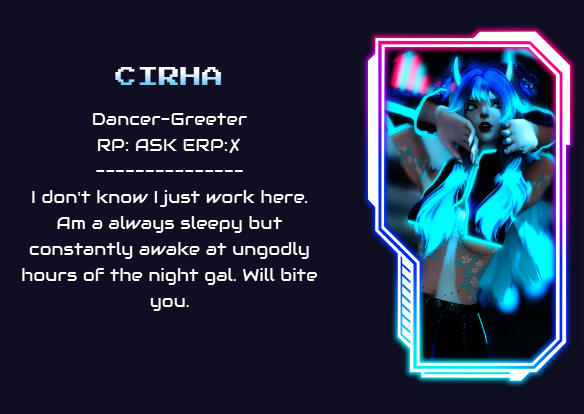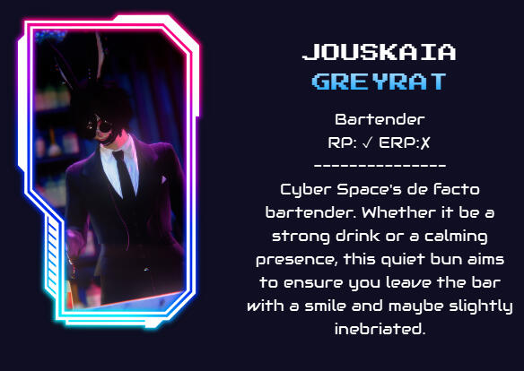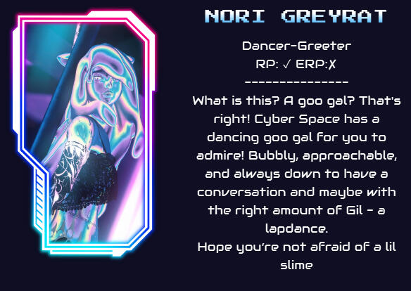 Welcome in to Cyber Space!Found in a small alcove at the Lavender Beds, our little slice of home lives to serve. Whether you wish to grab a drink from the bar and dance your night away, or take the time to lounge and enjoy the eye candy, Cyber Space was made for the Edgerunners and Mooks alike. So take it to the edge and lose yourself in the music and company.While RP is encouraged in our venue it isn't required!