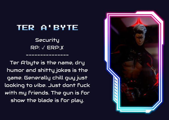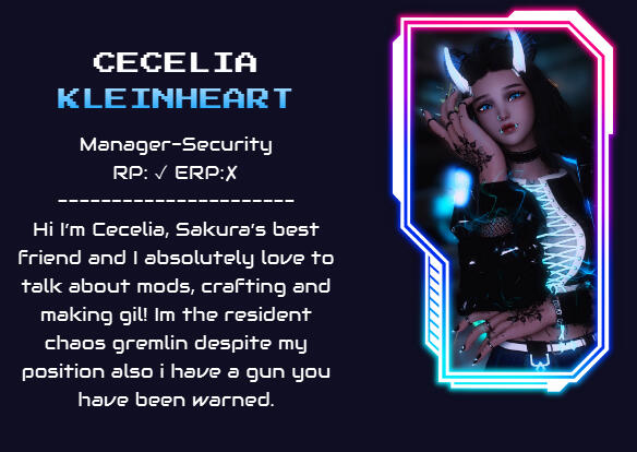 Welcome in to Cyber Space!Found in a small alcove at the Lavender Beds, our little slice of home lives to serve. Whether you wish to grab a drink from the bar and dance your night away, or take the time to lounge and enjoy the eye candy, Cyber Space was made for the Edgerunners and Mooks alike. So take it to the edge and lose yourself in the music and company.While RP is encouraged in our venue it isn't required!